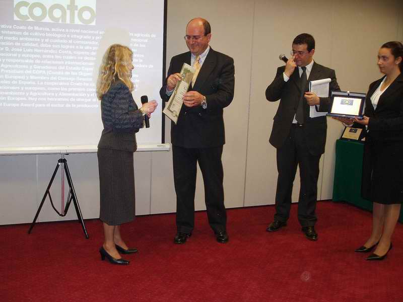 Europe Award for the Ecological Agricultural Production (Fiumicino, 24th November 2007) Coato, a cooperative company from Murcia, nationally operating in the sector of the agricultural production using biological and integrated cultivation systems respecting the environmental rules and customer guarantees by adopting quality certification systems, reached his goals thanks to the professional skill of its president, Dr. José Luis Hernandez Costa, who took up important charges like Member of the Executive Board of the international relations of COAG (Coordenadora de Organizaciones de Agricultores y Ganaderos del Estado Español), representative Member of COPA Presidium (Comité de las Organizaciones Profesionales Agrarias de la Unión Europea) and Member of the Consejo Reactor de la Confederación de Cooperativas Agrìcolas de España. Coato Cooperative obtained important national and European decorations among which the awards conferred by the Spanish Environment, Agricultural and Food Ministries and the European Environment Award conferred by the European Union. |